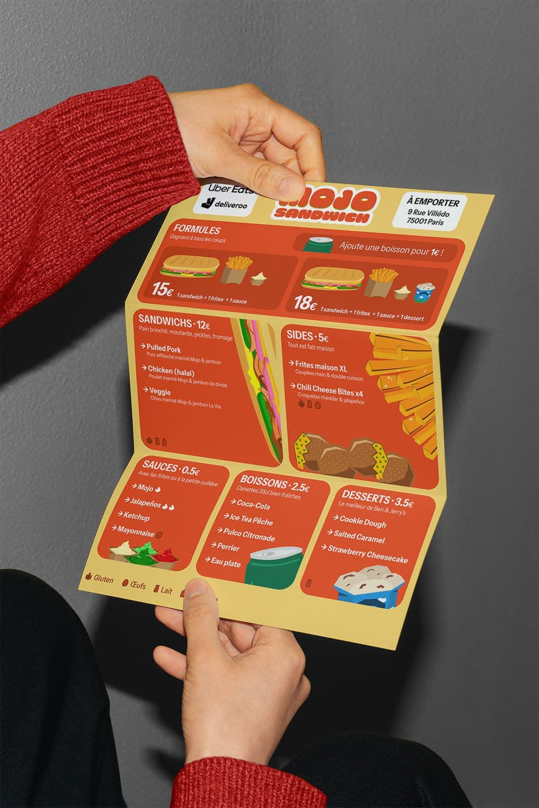 Mojo Sandwich is a pop-up restaurant we opened for a month as a side project with a friend during summer 2024. I worked on the whole graphic identity of the brand, print and web.